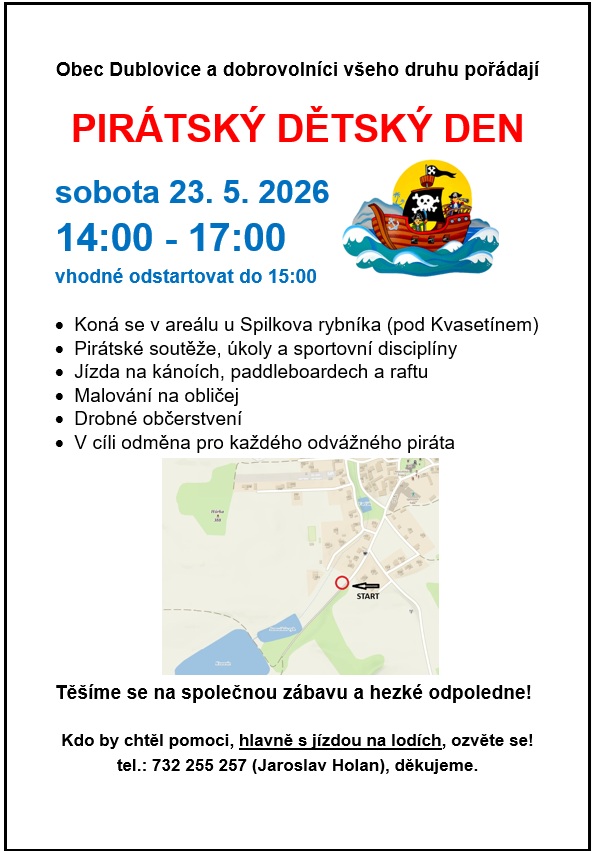 V sobotu 23.5. pořádá obec Dublovice Dětský den v areálu u Spilkova rybníka. Soutěžit bude možné od 14:00 do 17:00 hodin. Pro děti jsou připraveny zábavné úkoly, sportovní aktivity, malování na obličej a též odměny pro odvážné piráty. Občerstvení zajištěno, přijďte, všichni jste srdečně zváni.