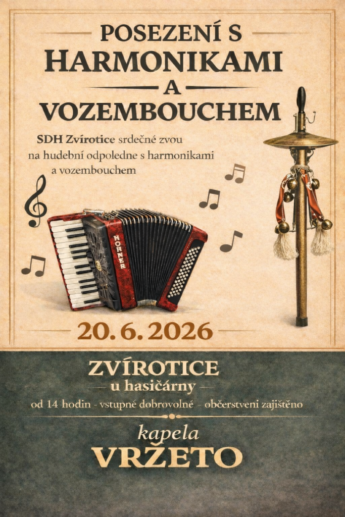 SDH Zvírotice pořádá v sobotu 20.6. od 14:00 hodin letní posezení s harmonikami a vozembouchem. Místo konání: před hasičskou zbrojnicí, za doprovodu živé kapely VRŽETO. Občerstvení zajištěno, vstupné dobrovolné. Tímto srdečně zvou hasiči ze Zvírotic, přijďte s námi užít pohodové odpoledne.