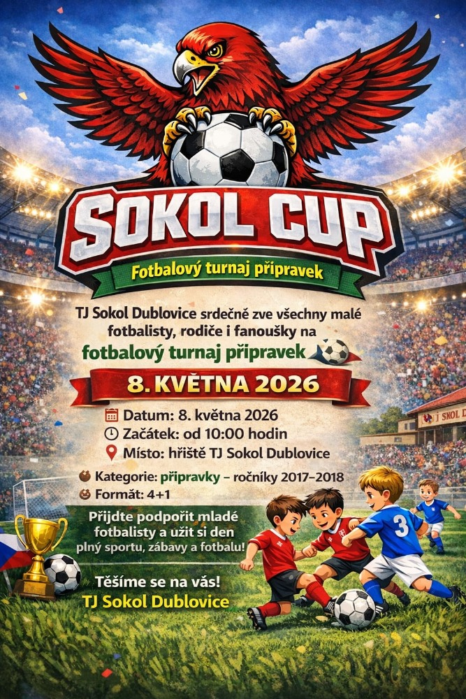Sokol Dublovice pořádá 8.5. od 10:00 hodin fotbalový turnaj přípravek "SOKOL CUP" (ročníky 2017 - 2018) na hřišti v Dublovicích. Přijďte podpořit mladé fotbalisty a užít si den plný sportu, zábavy a fotbalu. Těšíme se na Vás, TJ Sokol Dublovice.