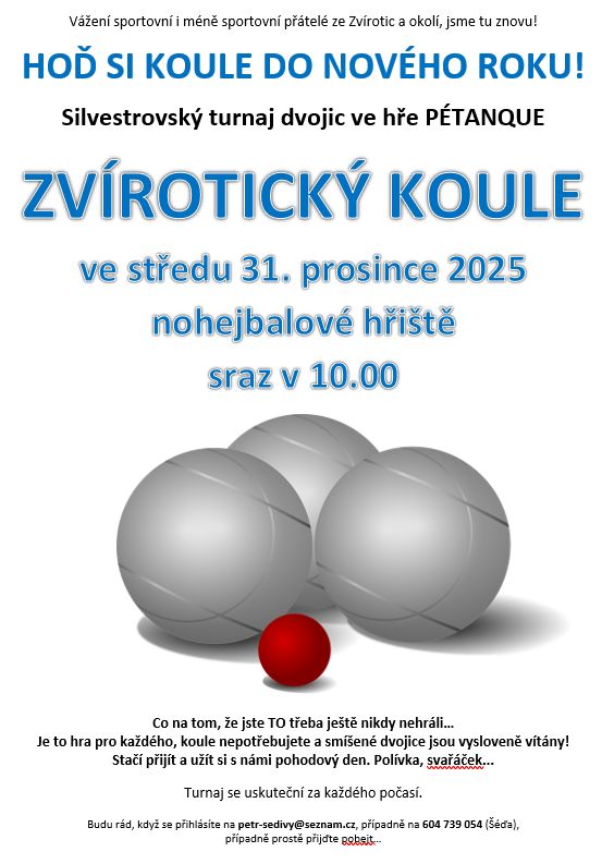 Zvírotice vás zvou na tradiční turnaj dvojic ve hře pétanque - Zvírotický koule. Turnaj se koná 31. prosince 2025 od 10:00 hodin na nohejbalovém hřišti. Všichni zájemci jsou vítáni a mohou se hlásit prostřednictvím e-mailu: petr-sedivy@seznam.cz nebo na tel. 604 739 054. Přijďte si užít pohodový den